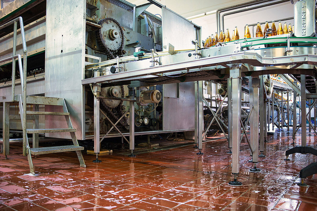 Nach der Auftragsvergabe wurden alle erforderlichen Maße vor Ort aufgenommen, so auch die von umliegenden Störkonturen für die neue Antriebstechnik. Die beengten Platzverhältnisse am Ein- und Auslauf des Pasteurs stellten eine zusätzliche Herausforderung dar. Sie machten eine Auslagerung der neuen Antriebe an die Außenseite der Maschine mittels einer Antriebskonsole erforderlich. Durch eine separat in der Motorkonsole gelagerte Steckwelle werden die Längendifferenz zum Antriebsritzel an der Anlage sowie die auftretenden Querkräfte ausgeglichen. Sämtliche auftretenden Kräfte wurden im Vorfeld berechnet und die Komponenten daraufhin ausgelegt. Die feuchte Umgebungsbedingung erforderte zudem eine spezielle Oberflächenschutzlackierung in OS4, die für den Einsatz in der Getränkeindustrie geeignet ist und chemischer Reinigung standhält.
