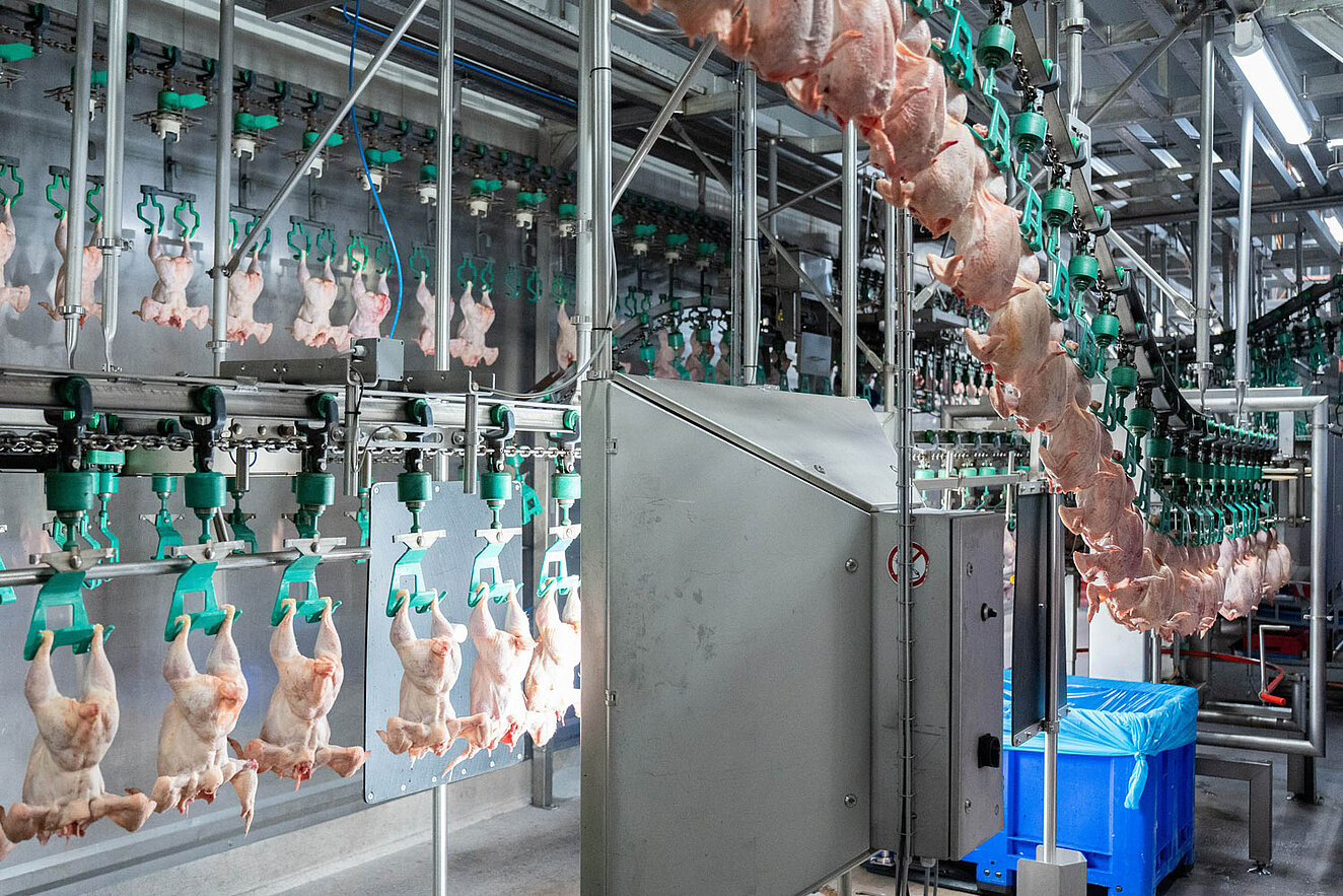 Ein Großteil der Geflügelprodukte wird bereits am Tag der Schlachtung versendet. „Das extrem kurze Zeitfenster in Kombination mit der geforderten Leistung stellt höchste Anforderungen an die Ausfallsicherheit der Anlage“, erklärt Yusuf Kaya, Key Account Manager bei Unitechnik. „Wir konnten dies über ein hohes Maß an Redundanz realisieren: Förderstrecken, Heber, Umreifer, Arbeitsplätze sowie Tablar- und Palettenhandling – alles ist mehrfach ausgelegt und auf neun Ebenen angeordnet.“