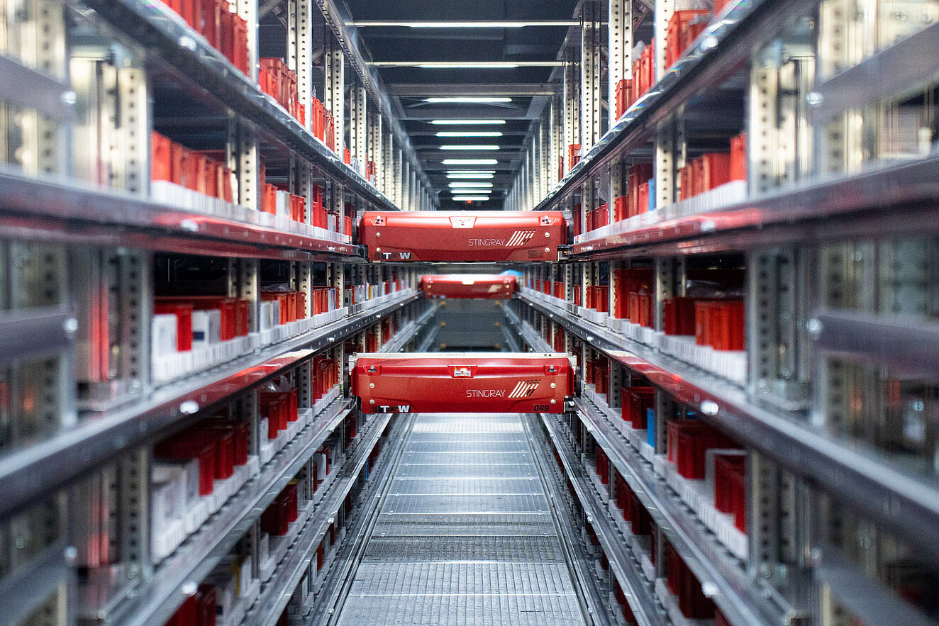 Kernstück der neuen Anlage ist ein hochautomatisiertes Shuttlelager mit 31.200 Behälterstellplätzen. Vier Gassen mit jeweils 26 Ebenen und insgesamt 104 Shuttle-Fahrzeugen ermöglichen eine hochdynamische und sequenzierte Ein- und Auslagerung – mit einer Leistung von je etwa 3.000 Behältern pro Stunde. Dieses Leistungsniveau war nur mithilfe einer durchdachten Detailplanung und intelligenten Materialflusssteuerung durch das Lagerverwaltungssystem UniWare möglich. Ergänzend installierte Unitechnik eine Verschieberegalanlage für den Bereich der Tiefkühllagerung mit rund 4.700 Palettenstellplätzen.