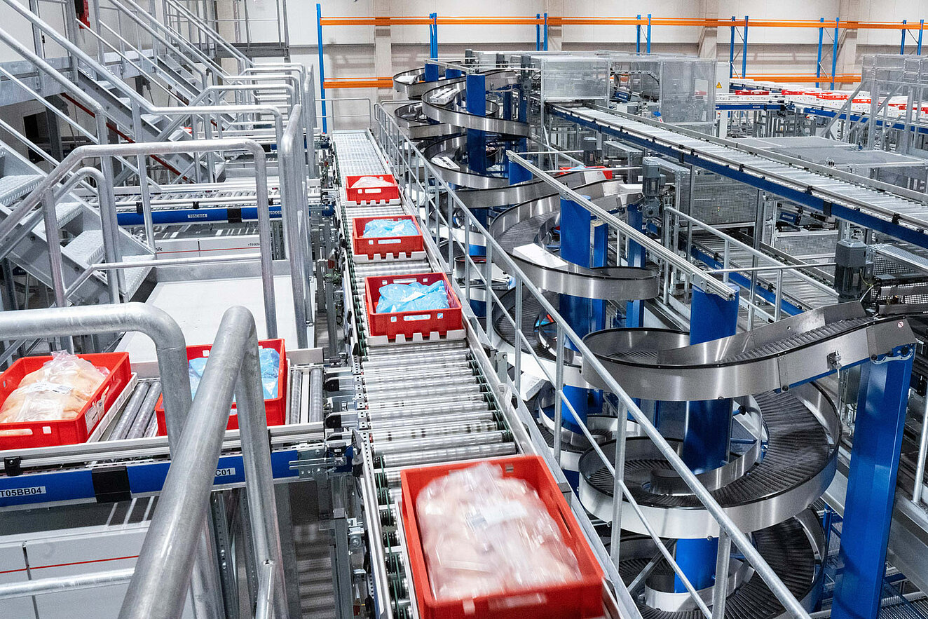 Um eine möglichst hohe Prozesssicherheit zu garantieren, werden Kartons und Kisten automatisch auf Tablare gesetzt. Dadurch arbeitet die nachfolgende Förder- und Lagertechnik mit einem einheitlichen Ladungsträger. Kartons werden vor dem Aufsetzen zusätzlich umreift. Anschließend lagert das System die Tablare mit ihrer Ladung ins Shuttle-Lager ein. Bei Abruf eines Auftrags werden die zugehörigen Warenträger exakt in der benötigten Sequenz ausgelagert, vom Tablar getrennt und über Spiralförderer an die darunterliegenden Arbeitsplätze geleitet. Dort stapeln die Kommissionierer die Ware gemäß den Anweisungen des Lagerverwaltungssystems UniWare auf automatisch bereitgestellte Paletten. Die absenkbare Palettenstation sorgt dabei stets für eine ergonomische Arbeitshöhe.