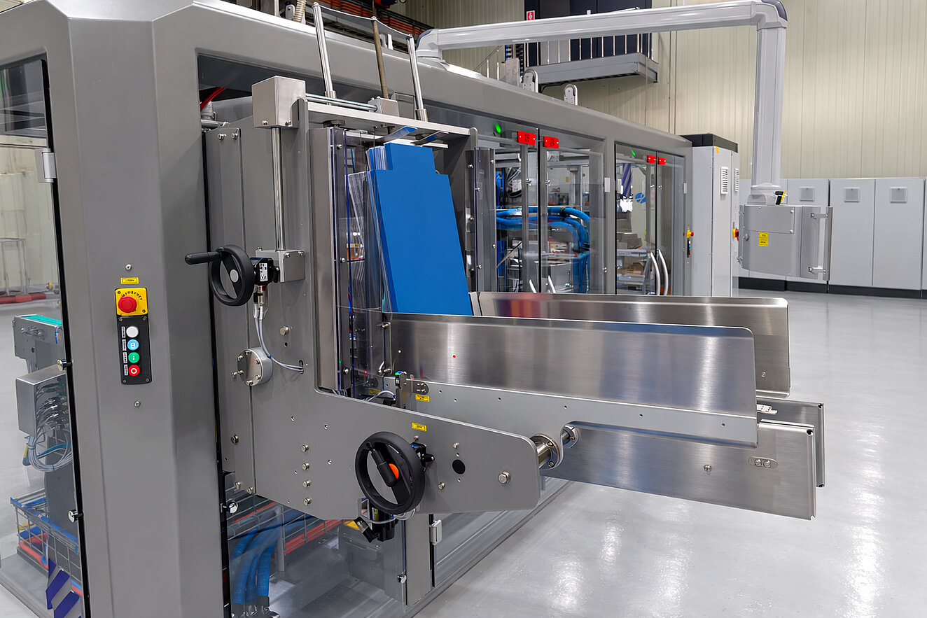 - Schnelle Formatverstellung: Produktwechsel gehören zu den größten Effizienztreibern moderner Linien. Die neue Serie ermöglicht eine vollständig werkzeuglose, schnelle Formatumstellung. Verstellpunkte sind klar definiert, reproduzierbar und nach dem Centerline-Prinzip ausgelegt. Das minimiert Rüstzeiten und reduziert Bedienfehler signifikant. Fünf Minuten Umstellzeit gelten bereits als Obergrenze.