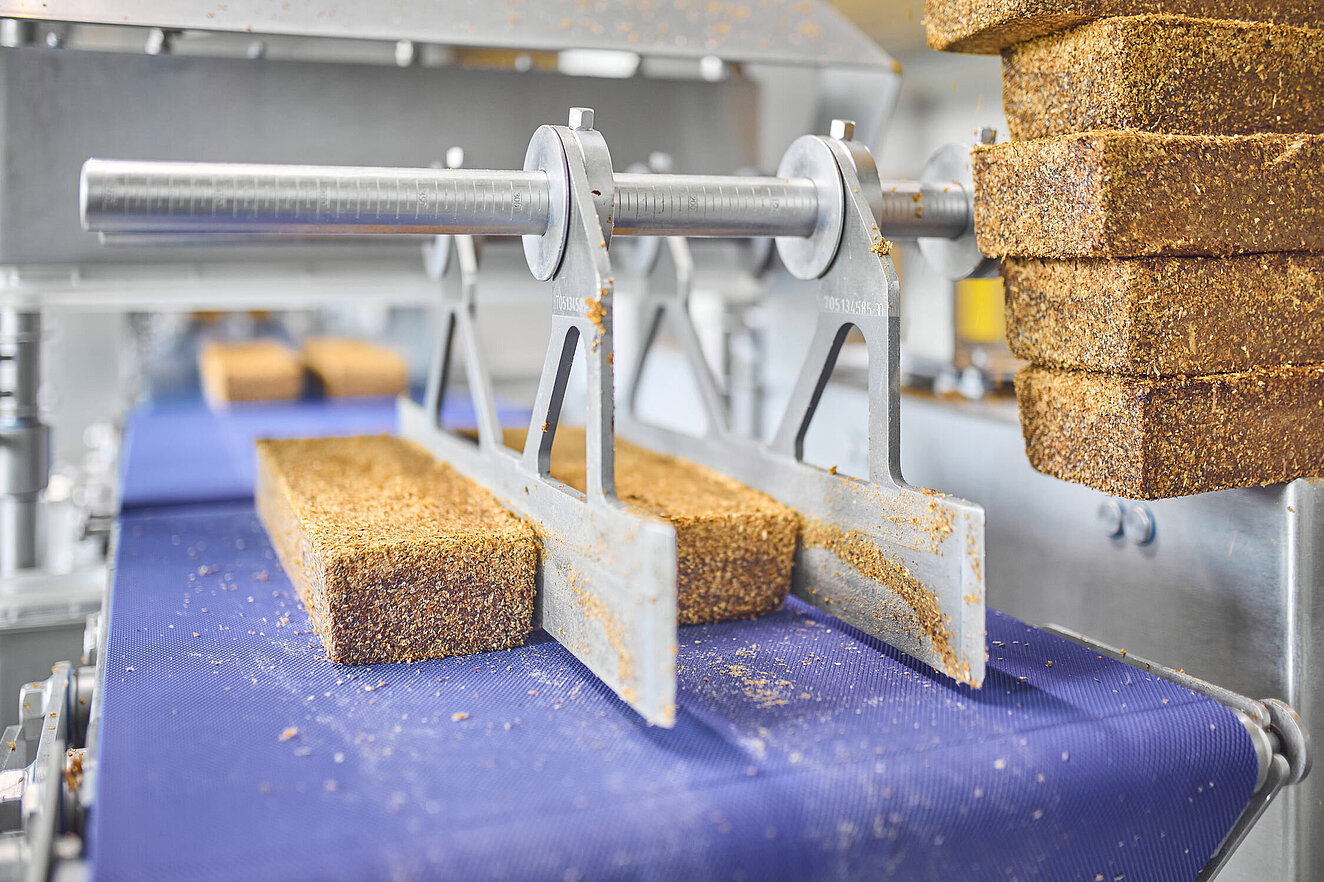 Nach der manuellen Zuführung werden die Brote zunächst vom weScan gescannt und von einer Waage gewogen, sodass das genaue Gewicht des Brotes bekannt ist. Anschließend wird der Slicer automatisch mit den Broten beladen. Zwei Variogreifer sorgen dafür, dass die Produkte unabhängig voneinander der Schneidkante zugeführt und somit individuell ihrem Gewicht entsprechend aufgeschnitten werden. So ist sichergestellt, dass jeder Stapel aus zehn Scheiben Roggenbrot mit einem Gesamtgewicht von 500 Gramm besteht. Anschließend werden die Stapel erneut gewogen und (derzeit noch) manuell verpackt.