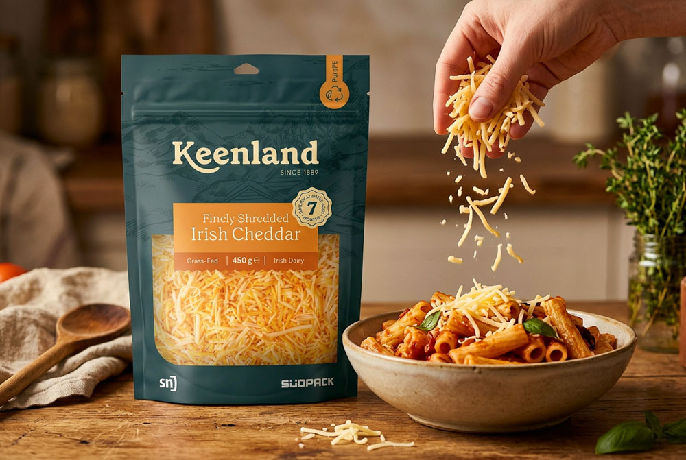 Für Anwendungen wie Reibekäse zeigt Südpack einen recyclingfähigen Standbodenbeutel auf Basis einer PE-Monostruktur. Durch den sortenreinen Aufbau kann die Verpackung dem entsprechenden Wertstoffstrom zugeführt werden. Trotz einer Materialstärke von lediglich 85 Mikrometern soll die Folie eine hohe Stabilität vergleichbar mit konventionellen Verbundlösungen bieten. Gleichzeitig stehen laut Hersteller individuell anpassbare Barriereeigenschaften für Produkt- und Aromaschutz zur Verfügung.