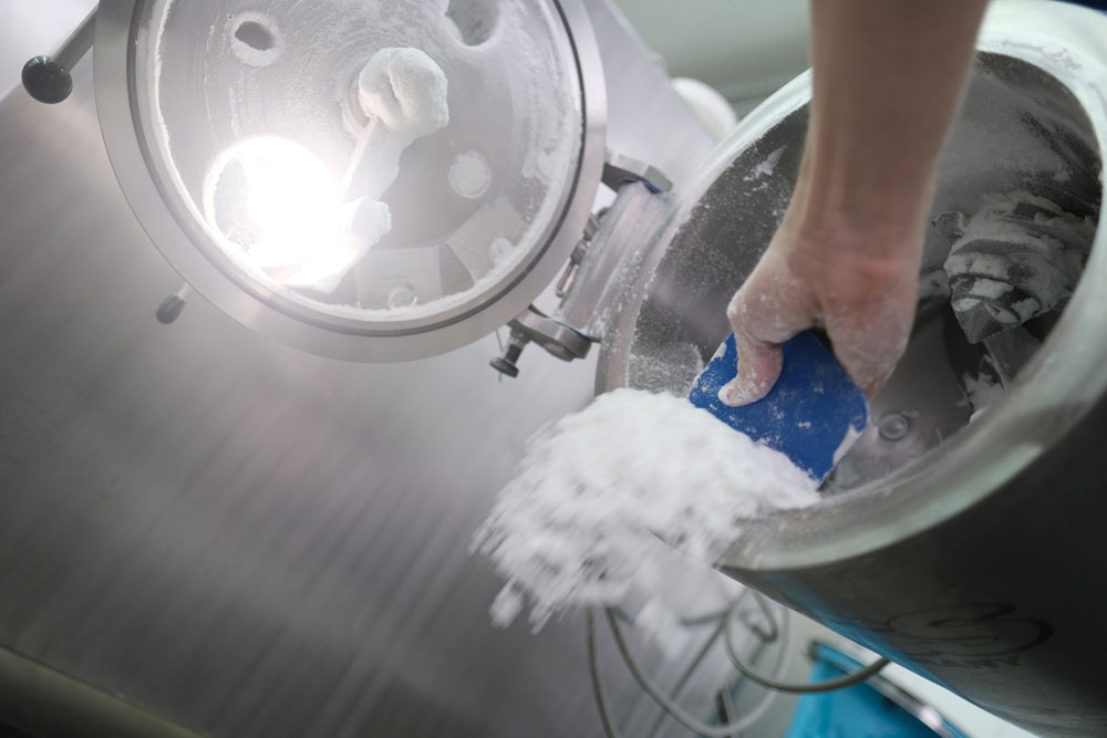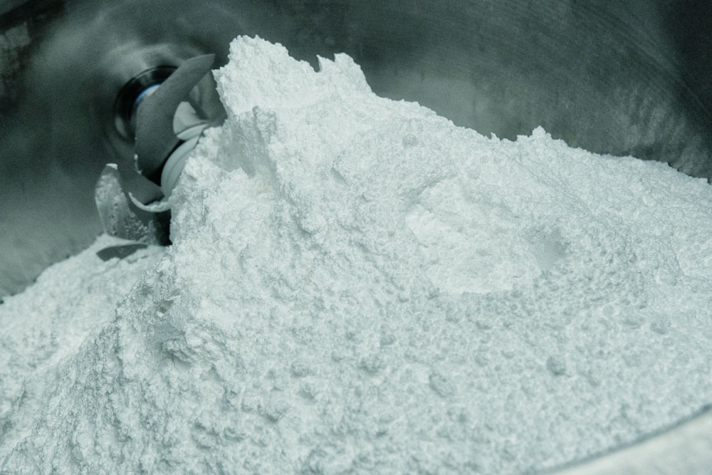 Die Fettzugaben und Temperaturen müssen exakt geregelt werden. Nachdem alle Partikel benetzt sind, muss das Mischgut so schnell wie möglich abgekühlt werden. Zum Einsatz kommt Kohlendioxidschnee mit einer Temperatur von minus 78 Grad Celsius. Die so beschleunigte Fettkristallisation verhindert ein Verklumpen und Verblocken des Puderzuckers. „Während dieser schockartigen Kühlung ändert sich das Fließverhalten schlagartig. Gleichzeitig entstehen große Gasmengen. Die Mischwerkzeuge und der Antrieb der Anlage müssen dafür ausgelegt sein“, beschreibt Finck die Anforderungen. Nur so lässt sich die Bildung von Agglomeraten und Kompaktierungen vermeiden – und entsteht eine Granulatstruktur, die sich positiv auf die Rieselfähigkeit des Dekorpuders auswirkt.